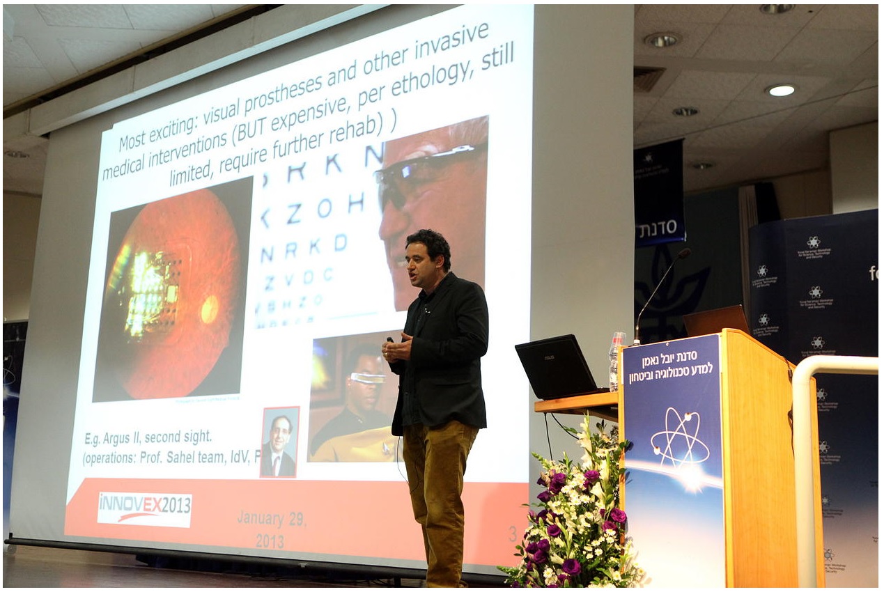 Sensory Substitution Devices take information from one sense and present it in another, for example enabling blind people to “see” by using other senses such as touching or hearing. By using a smartphone or webcam to translate a visual image into a distinct soundscape, SSDs enable blind users to create a mental image of objects, such as their physical dimensions and color. With intense training (now available online at www.amedilab.com), blind users can even “read” letters by identifying their distinct soundscape.