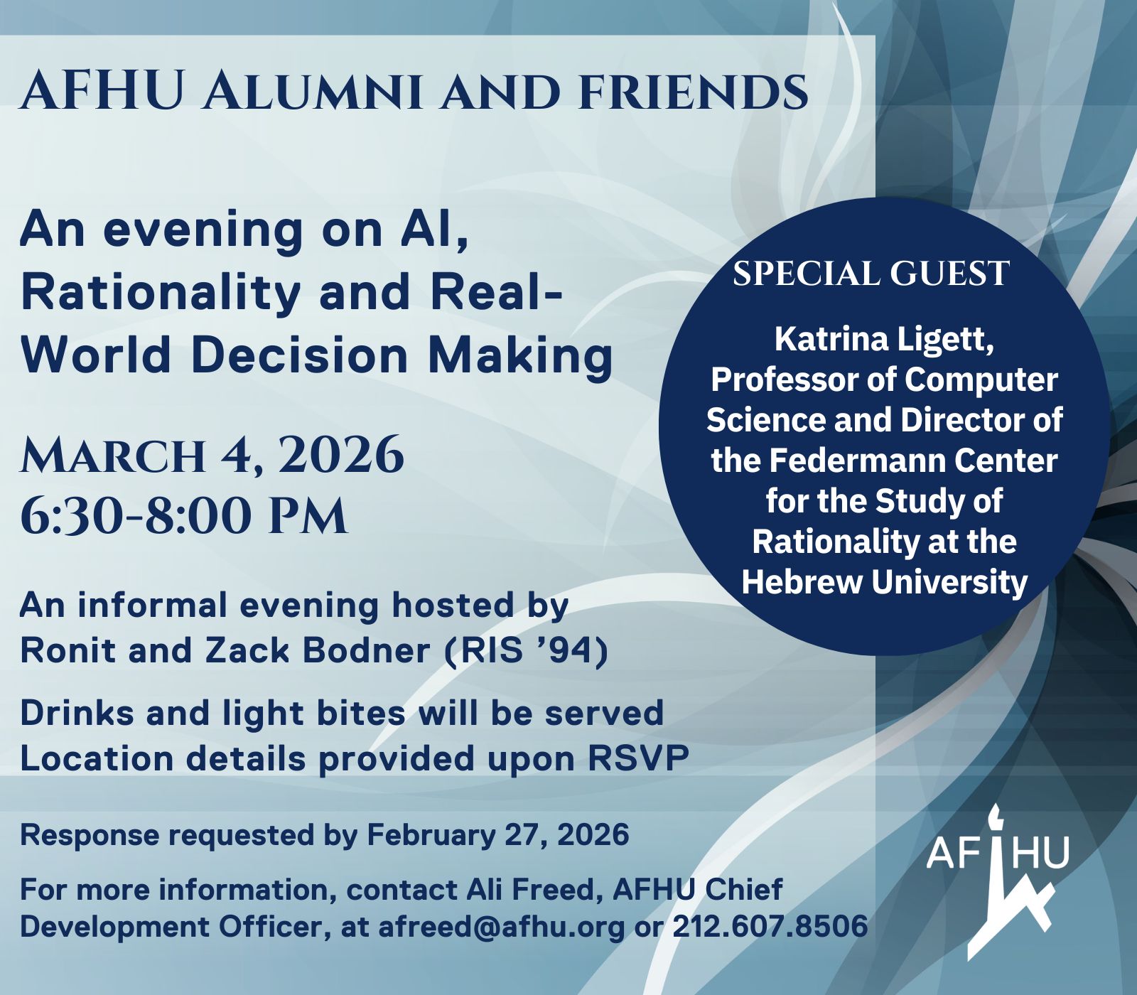 Please visit afhu.org/alumni and connect with us on Facebook and LinkedIn.