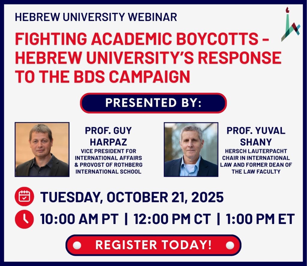Please join us on Tuesday, October 21, for a webinar with Professors Guy Harpaz and Yuval Shany from the Hebrew University of Jerusalem (HU). Harpaz and Shany will examine the challenges the Hebrew University faces in the context of the global boycott movement. The discussion will address how the boycott against HU manifests itself and its links to wider anti-Israel and antisemitic trends, the arguments made by its supporters, and the counterarguments HU advances. The speakers will share how HU is engaged on this front, highlight the efforts being made to push back against these narratives, and offer forward-looking ideas on how we can strengthen our strategy and build resilience for the future.