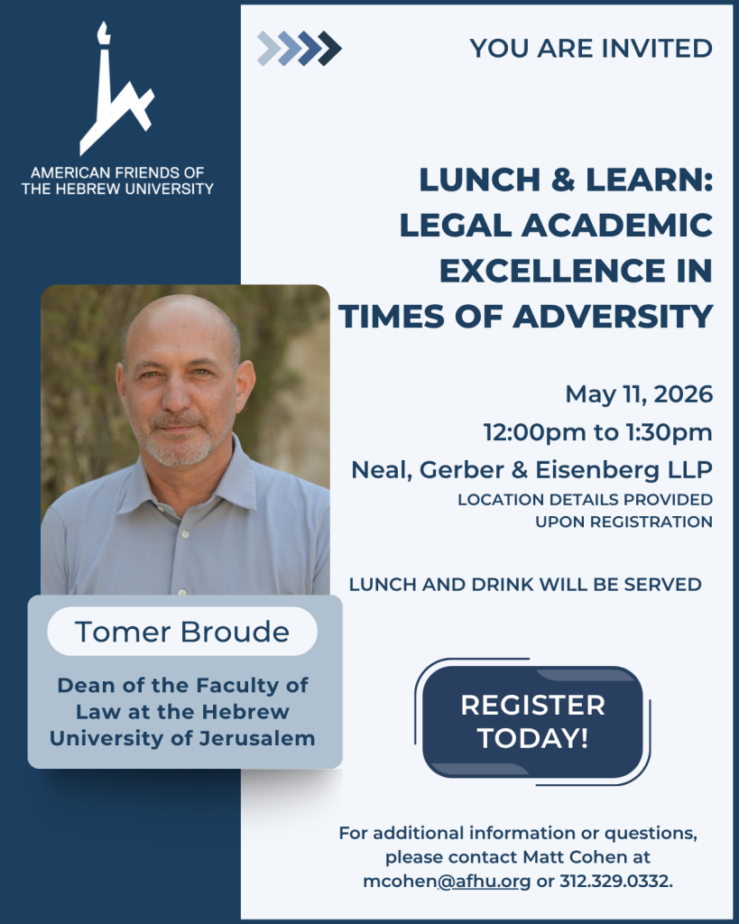 AFHU Midwest Region & Neal, Gerber & Eisenberg LLP invite you to an inspiring and informative luncheon and discussion with Tomer Broude, Dean of the Faculty of Law.