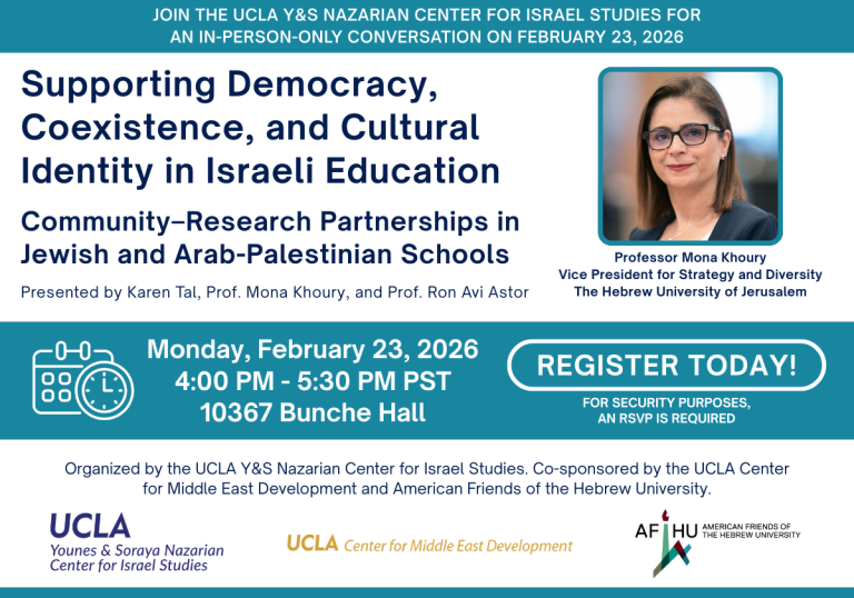 Organized by the UCLA Y&S Nazarian Center for Israel Studies. Co-sponsored by American Friends of the Hebrew University, the UCLA Luskin School of Public Affairs, and the UCLA Center for Middle East Development.
