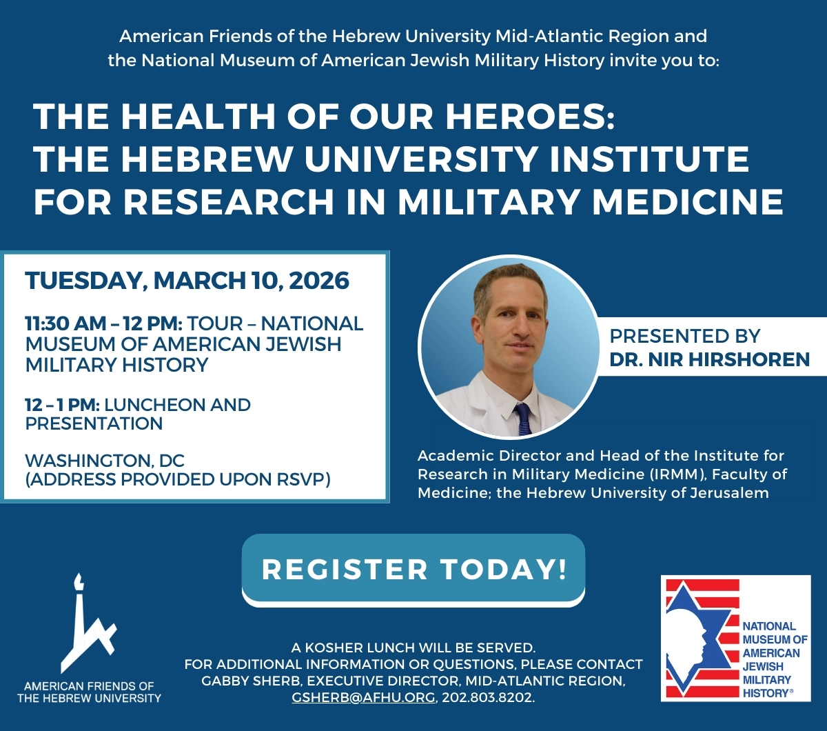 In 2009, the Hebrew University-Hadassah Medical School partnered with the Israel Defense Forces (IDF) Medical Corps to form the joint Military Medicine Program. Join AFHU and the NMAJMH for an exclusive exhibit tour, and learn about the IRMM, and the operational arena provides a unique research and development framework in military medicine whose principal objective is to prolong survival, hasten recovery, and improve the quality of life of our soldiers and civilians in times of peace or during hostilities.